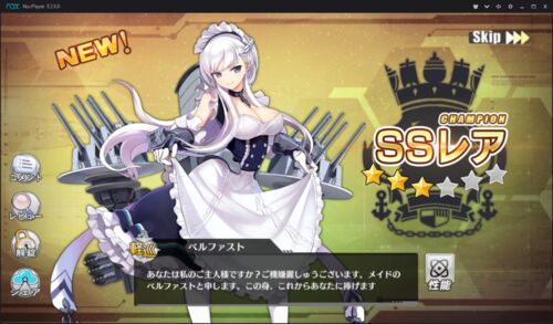 10日くらい前から開始。 艦これといった艦船擬人化ゲームの一つで、中国のゲームを日本展開したもの。グラブルの神石ゲーに耐えきれなかった身としては、 札束で叩かんでも十分楽しめるゲームってだけで楽しい。 ちまちまプレイしてればSSRが確定で手に入る…